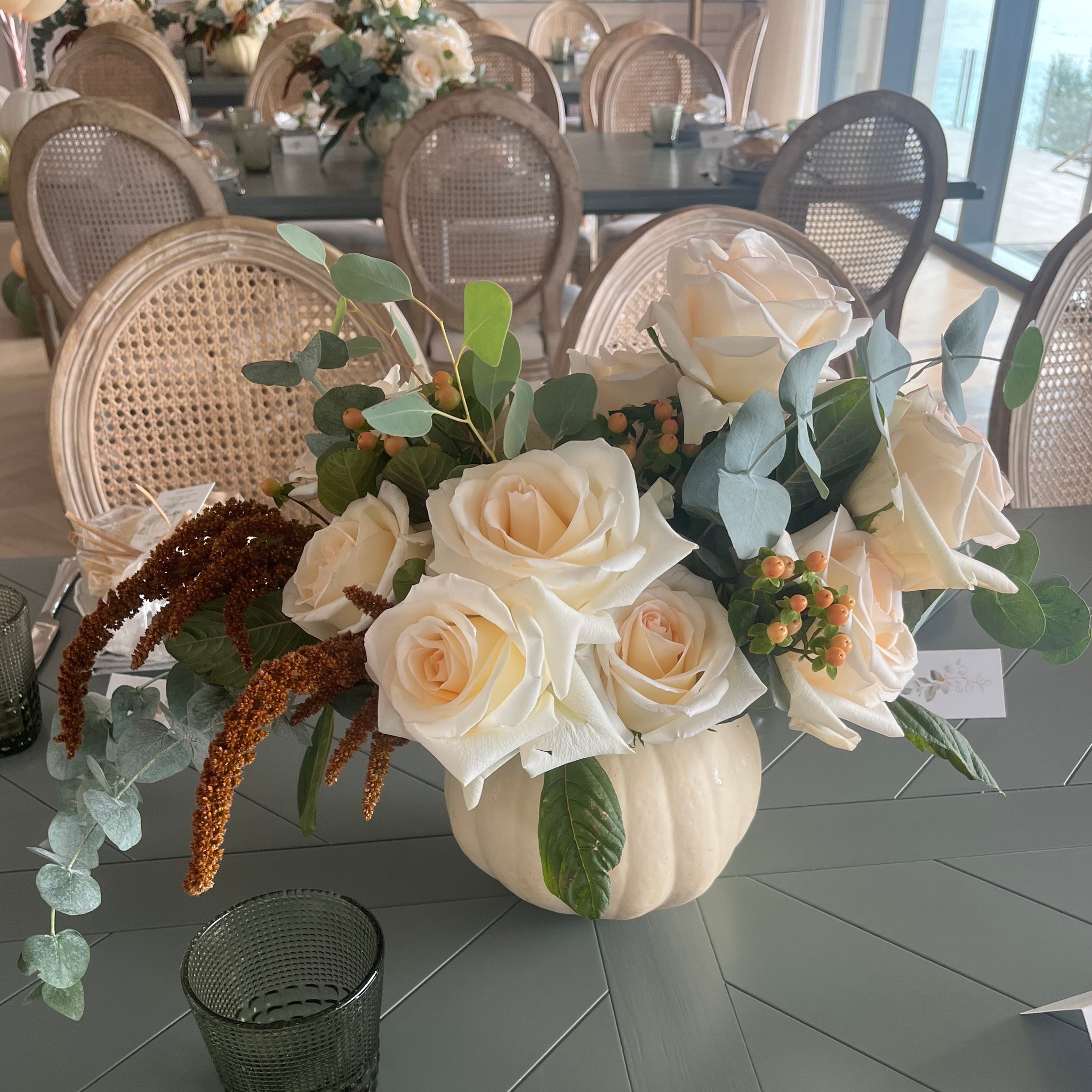 We can create beautiful flower-filled pumpkin centerpieces starting at $60 (pumpkin pie size) up to $150 (in a large/specialty pumpkin).
